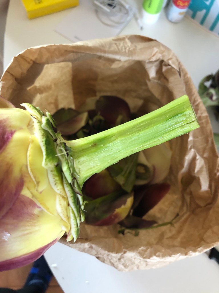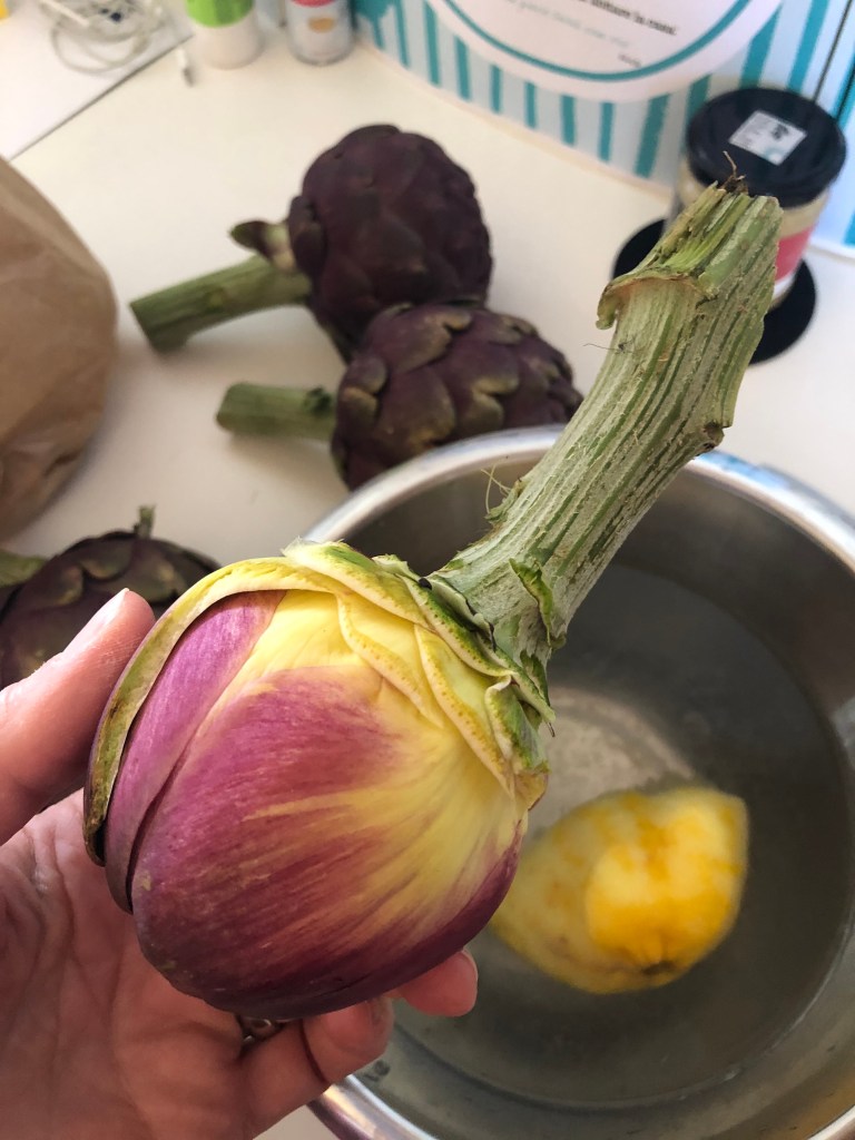 Si taglia poi il carciofo a metà e con un coltellino si estrae la “peluria/fieno/barba” interna, nel caso di carciofi con le spine è meglio togliere anche le prime foglioline interne, abbastanza pungenti! Se vi serve il carciofo intero, potete entrare nel cuore con uno scavino, tipo quello che si usa per le palline di melone o anguria, rigirarlo all’interno e estrarre la peluria. Con carciofi giovani e teneri si può evitare questa procedura.