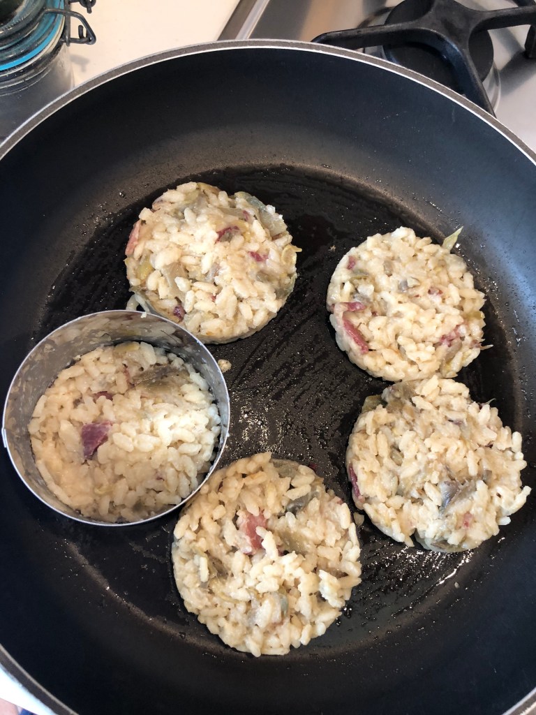 La difficoltà maggiore del riso al salto è girarlo, ma non serve prepararlo delle stesse dimensioni del piatto di portata, si possono fare dei dischi di 5/6 centimetri più facili da gestire e più simpatici da vedere. Un coppapasta può aiutare, altrimenti usare il buon vecchio cucchiaio.