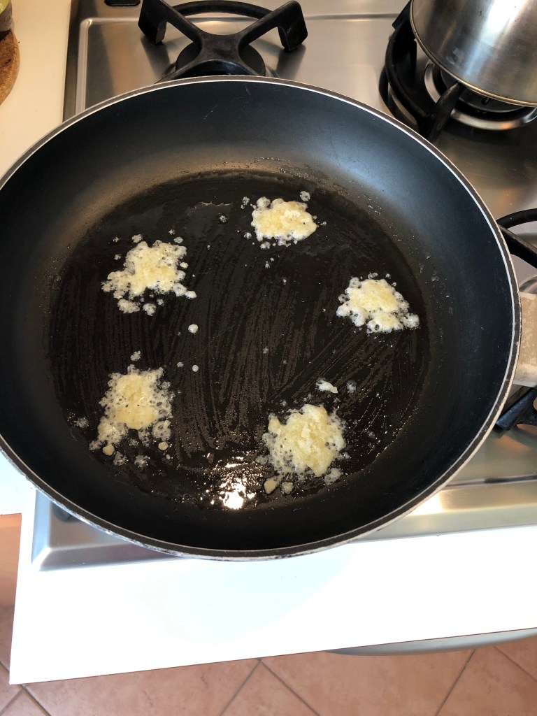 Ungere una pentola antiaderente con del burro, scaldarla bene e disporre all’interno dei cucchiaini di parmigiano grattugiato ben distanziati. Quando inizieranno a sciogliersi, abbassare la fiamma e posizionare su ognuno il coppapasta in cui adagiare un cucchiaio di risotto schiacciandolo bene sul fondo e verso le pareti, poi ripetere su ogni cucchiaino di parmigiano. Se non avete un coppapasta, formate delle palline di risotto e schiacciatele alle estremità, compattandole bene con le mani, poi posizionatele sopra il parmigiano. Meglio prepararle prima di accendere il fuoco sotto la pentola.