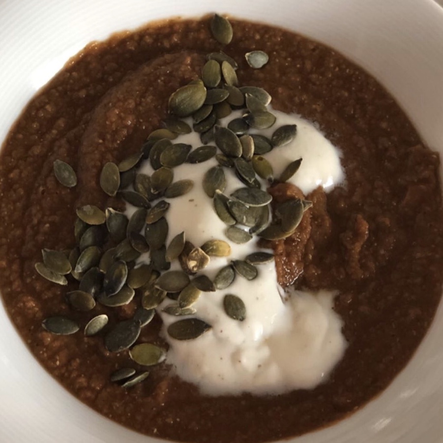 Condire lo yogurt con sale e pepe. Scaldare i semi di zucca in una pentola antiaderente. Impiattare la zuppa, aggiungere una cucchiaiata di yogurt e una di semi di zucca.