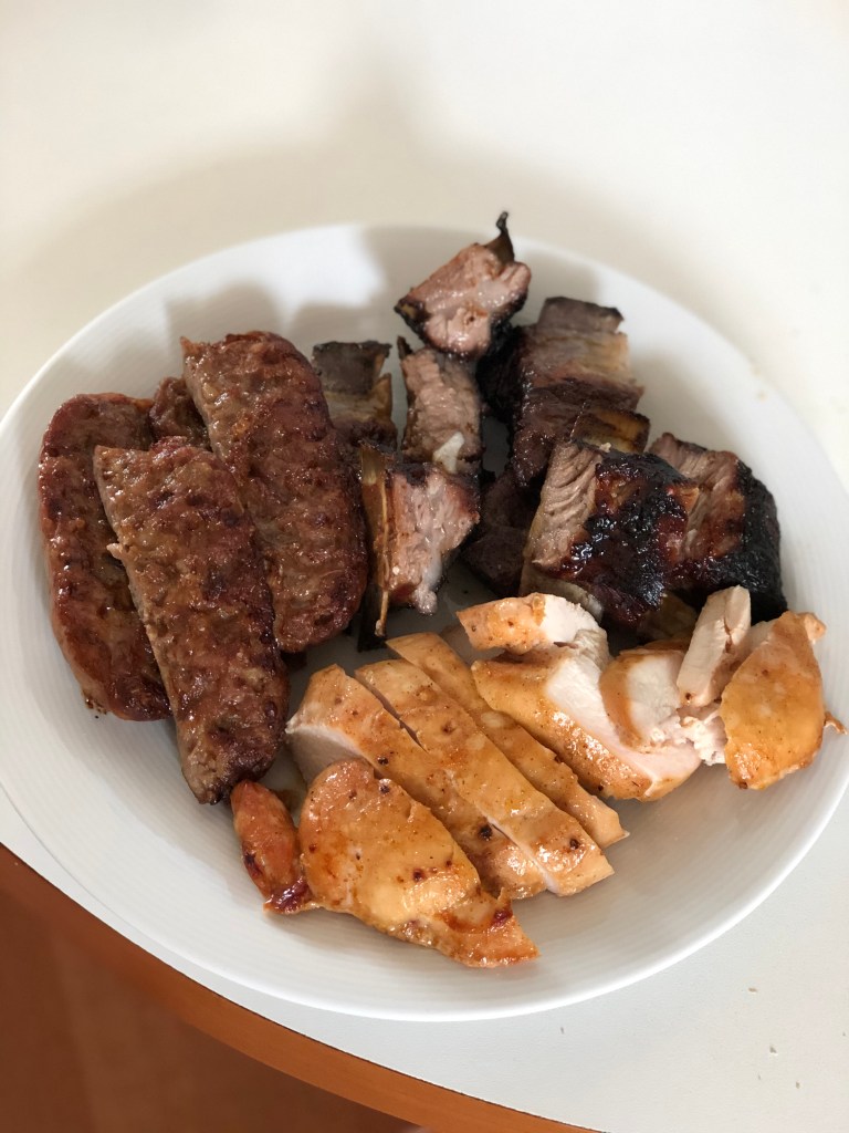 La mia carne di oggi: costine di maiale, salamelle mantovane, petto di pollo intero (senza pelle). Non sgrassate troppo le costine: il grasso si scioglierà in cottura e lo lascerete sul forno della teglia. Attenzione con il bbq tradizionale: se usate una fiamma troppo alta, il grasso colando sulla carbonella farà fumo e fiamme, rischiando di dare alle costine uno sgradevole sapore di bruciato.