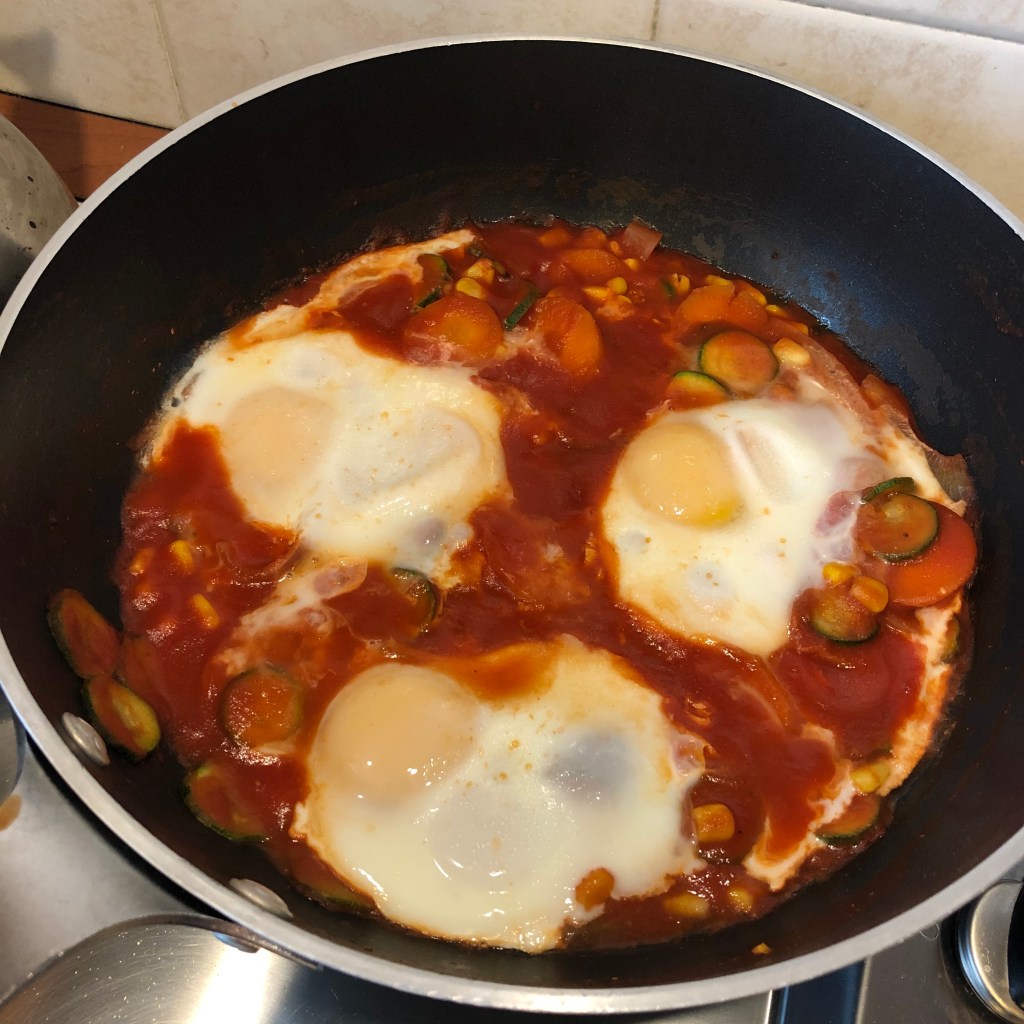 Troverete facilmente su internet la ricetta originale. Qui vi spiego come l’ho preparata io oggi. L’ultima volta che l’ho cucinata ho usato cipolla rossa, zucchina e carota. Oggi ho aggiunto del mais… peperoni non pervenuti. Secondo me, quando oltre al pomodoro e alle uova c’è cipolla, aglio e spezie, c’è tutto quello che serve!
