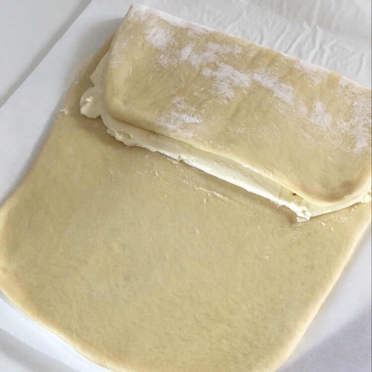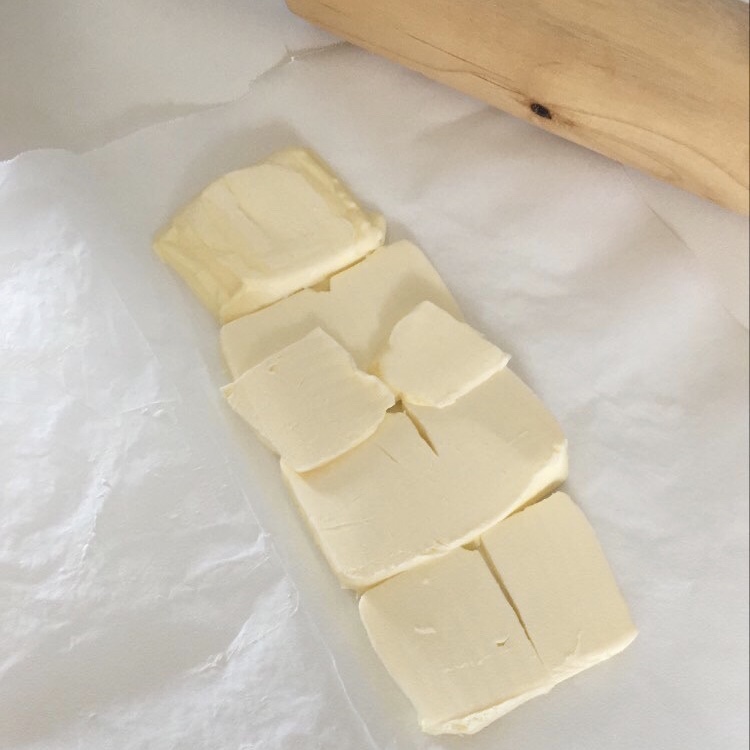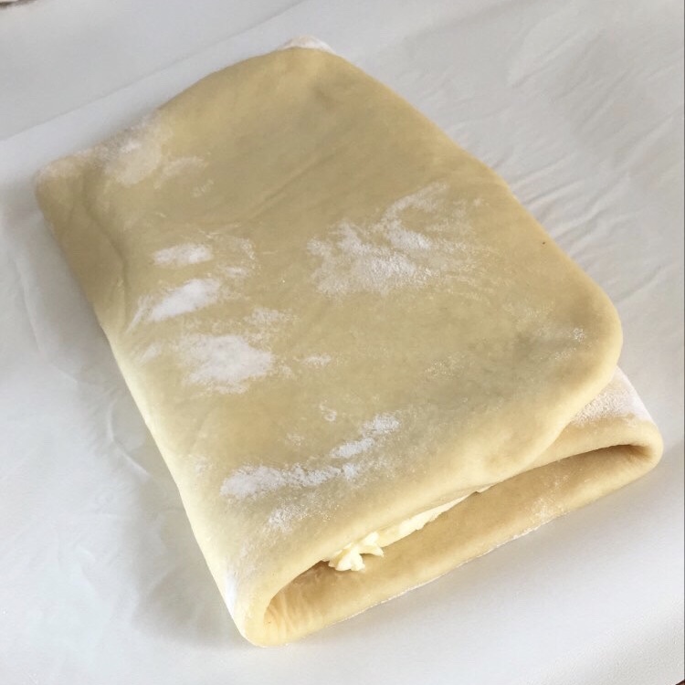 Tirate la pasta con il matterello fino a raggiungere uno spessore di 4-5 mm e mettete al centro il burro freddo. Ripiegate la pasta sul burro e lasciate raffreddare 10 minuti in frigorifero.