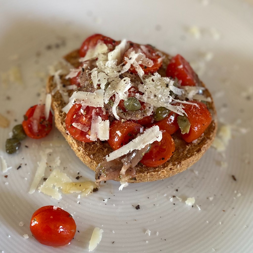 - pomodorini, acciughe, capperi, pecorino, olio evo, sale, pepe