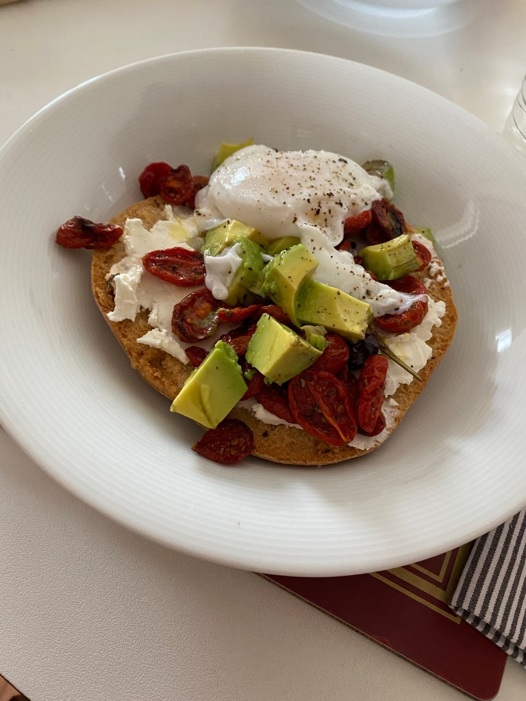 - ricotta fresca, pomodorini confit, avocado, uovo in camicia, olio evo, sale, pepe