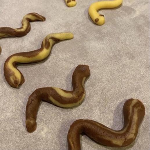 Riprendete i ritagli bianchi e al cacao e impastateli leggermente, senza amalgamare troppo i colori. Formate dei cilindri di circa 1,5 cm di spessore, lunghi 10-12 cm. Arrotondate un’estremità e affusolate quella opposta, poi disponete i bruco-serpenti su una teglia coperta con carta da forno creando delle S.