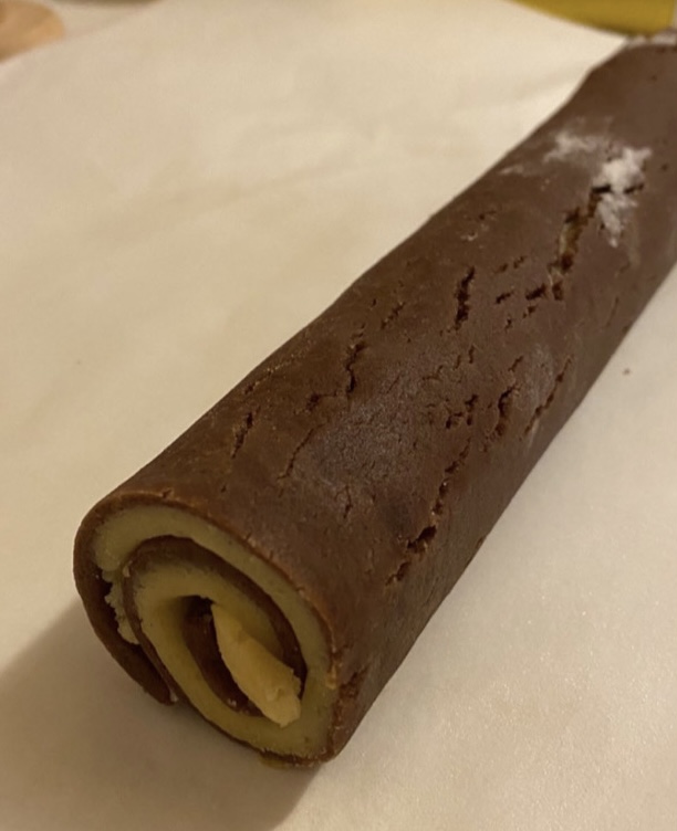 Togliete il rotolo bi-colore dal frigorifero e tagliatelo a fette da 3-4 mm.